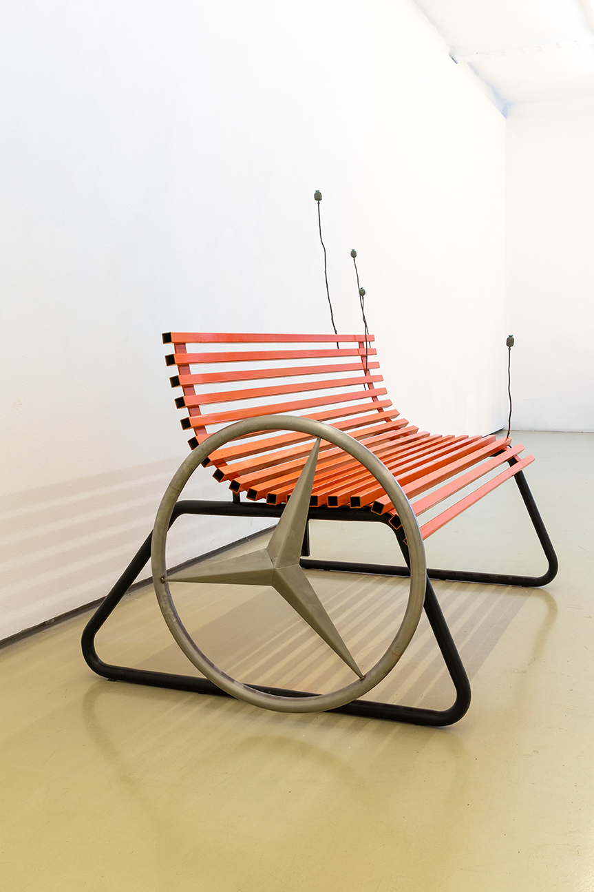 Parkbank after R. Wagner‘s Tannhäuser (Rapperkrieg auf der Parkbank), 2024 Stainless steel bronze cast various materials 135 x 160 x 100 cm Photo: © Gallery Krinzinger & Tamara Rametsteiner