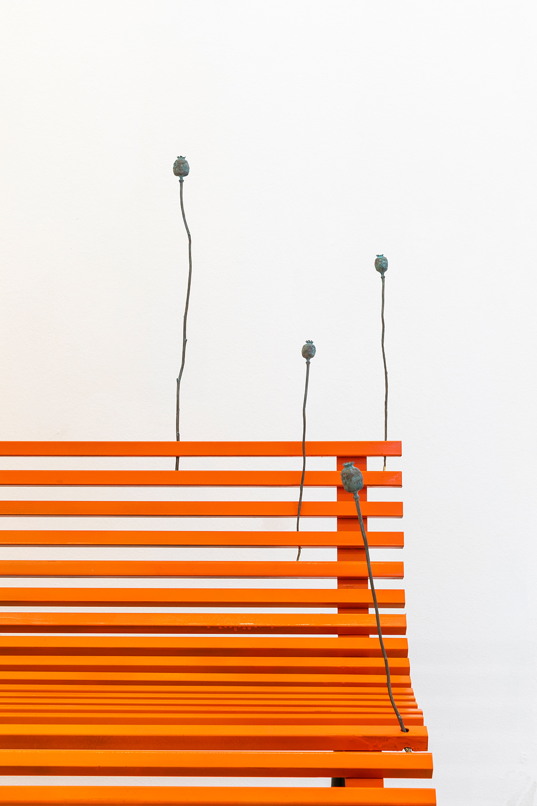 Parkbank after R. Wagner‘s Tannhäuser (Rapperkrieg auf der Parkbank), 2024 Stainless steel bronze cast various materials 135 x 160 x 100 cm Photo: © Gallery Krinzinger & Tamara Rametsteiner
